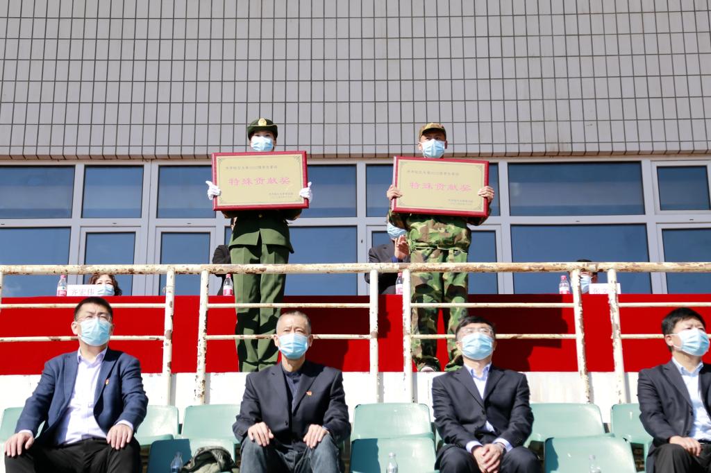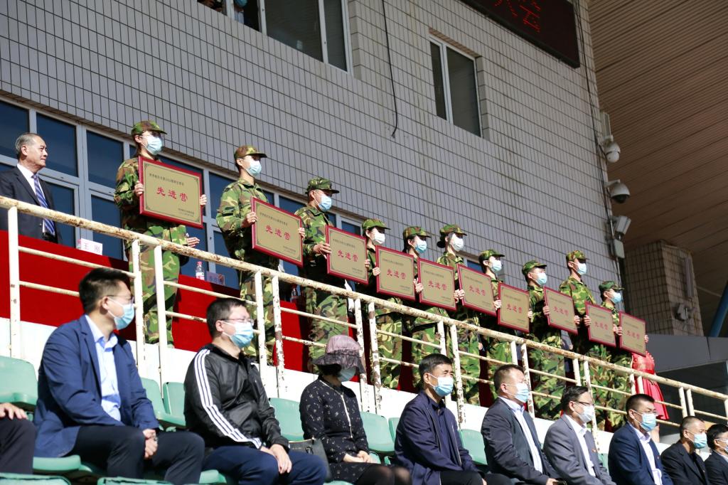 校工会主席陶佰睿宣读了军训表彰名单,与会领导为荣获先进营及特殊贡献奖单位代表颁发了荣誉奖牌。随后,参训新生代表进行了精彩的军训汇报表演。