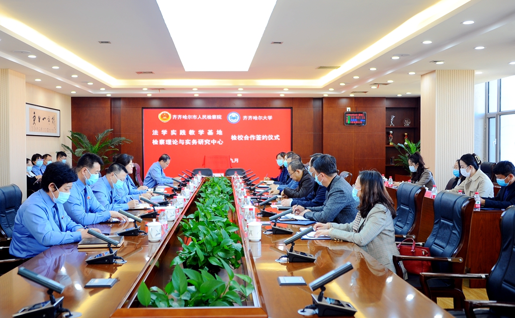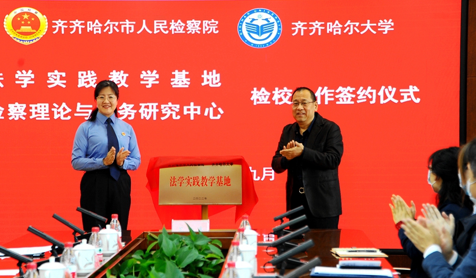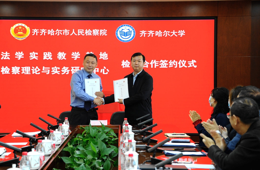 9月28日下午,LETOU国际米兰官网与齐齐哈尔市人民检察院校检合作签约暨“LETOU国际米兰官网法学实践教学基地”“LETOU国际米兰官网检察理论与实务研究中心”揭牌仪式在市检察院举行。齐齐哈尔市人民检察院党组书记、检察长曲立新及市检察院领导班子成员,LETOU官网校长董玉庭、副校长李奇楠出席仪式,市检察院中层正职以上干警,LETOU官网科研处、教务处、哲学与法学学院负责人以及哲学与法学学院部分教师代表参加仪式。仪式由市检察院党组成员、政治部主任李文新主持。