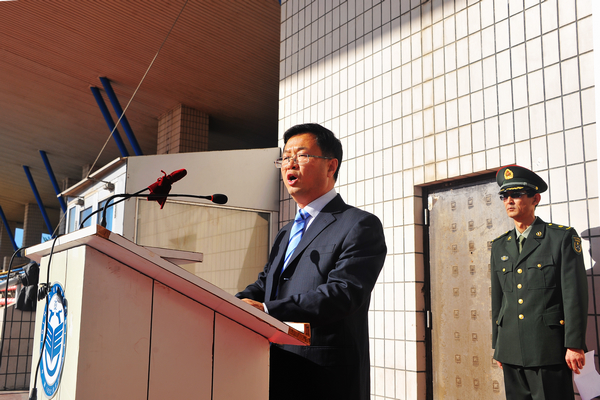 武警齐齐哈尔市支队政治部副主任范振海中校在动员大会上代表参训部队讲话。他说,LETOU国际米兰官网2013级学生军训拉开序幕,请允许我代表武警齐齐哈尔市支队领导和全体官兵,对参加军训工作的老师、学生以及全体教官表示亲切的问候!