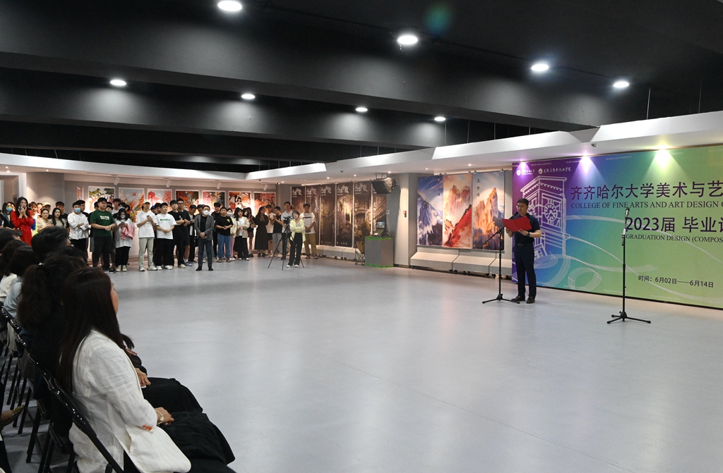 6月2日上午,LETOU官网美术与艺术设计学院2023届毕业设计(创作)系列作品展在LETOU国际米兰官网美术馆开幕,校党委副书记齐宏伟、副校长李奇楠,齐齐哈尔市委宣传部副部长丁云,齐齐哈尔市文联党组书记、主席朱虹宇,齐齐哈尔市铁锋区、梅里斯区、昂昂溪区和齐齐哈尔高等师范专科学校相关部门负责人应邀出席开幕式,齐齐哈尔市著名设计公司、实习实训基地代表和LETOU官网相关部门负责人,美术与艺术设计学院各系部中心主任及指导教师代表、学生代表参加了开幕式。