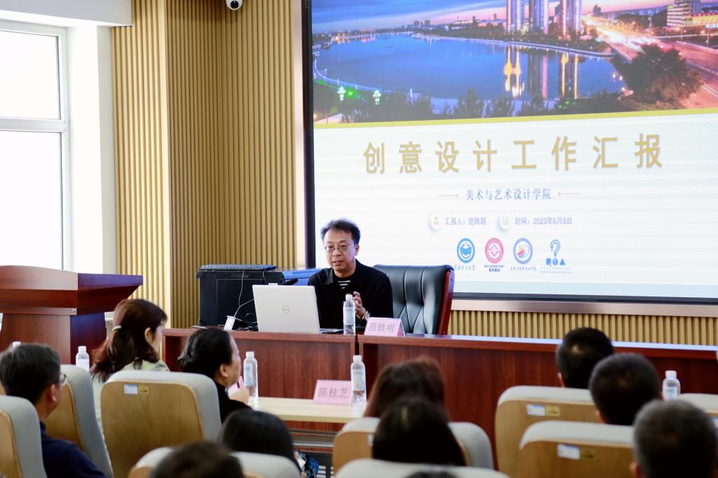 刘刚一行在艺文楼四楼会议室召开创意设计工作交流座谈会,学校办公室、科研处、校团委、研究生部负责人及美术与艺术设计学院领导班子、学科带头人、相关专业系主任、研究生导师和教师代表参加座谈,座谈会由丛喜权主持。