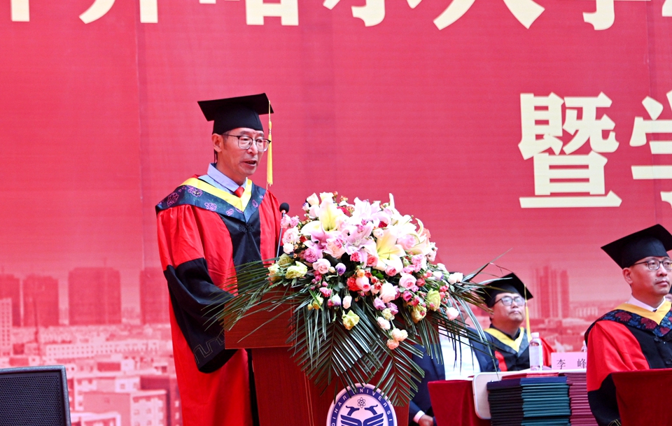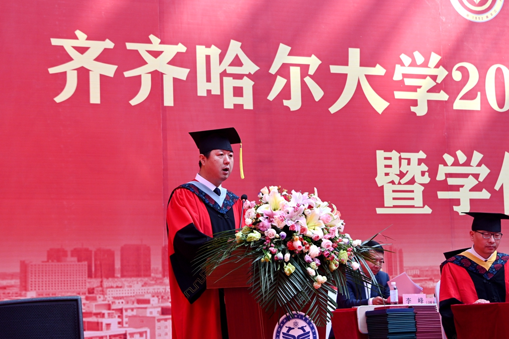 他说,“毕业”既标志着一段学习经历的完结,也标志着人生新的征程的开启。回首往昔,你们在齐大度过了一段极不平凡的青春岁月,在美丽的环湖大学,度过了最美的青春时光。特别是你们在学校,学习生活期间,克服了疫情影响,圆满完成了学业,以各方面的优异表现,交上了一份完美的毕业答卷。你们彰显着齐大学子的家国情怀和赤子之心,传递了齐大正能量和好声音。母校为你们点赞,向你们致敬!作为校长,我为大家圆满完成学业感到由衷地高兴,更对同学们的美好未来充满着期待!临别之际,我对同学们提出四点希望和嘱托:一是希望你们树立远大理想,坚定信仰信念;二是希望你们心怀“国之大者”,担当时代责任;三是希望你们坚持吃苦耐劳,始终砥身砺行;四是希望你们保持永久奋斗,投身强国伟业。