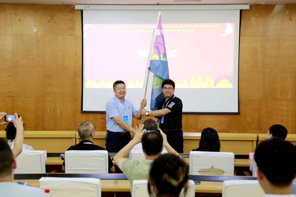 李杰在闭幕式上宣布了下一届竞赛承办单位,王志刚教授代表学校向大庆师范学院副院长殷亚杰交接赛旗。