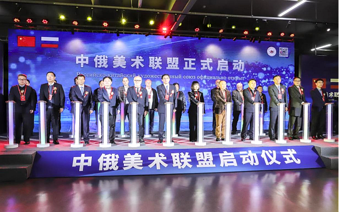 省教育厅副厅长董成、哈尔滨师范大学党委书记孙立军、俄罗斯莫斯科国立苏里科夫美术学院院长阿纳托利·柳巴温、中国国家画院原院长卢禹舜先后在启动仪式致辞。哈尔滨师范大学校长蒋鲲宣读了中俄美术联盟宣言和首批联盟成员名单。郝文斌与中俄美术联盟各方代表共同上台,触摸启动按钮,点亮象征联盟宗旨“自愿、平等、合作、共赢”的光柱,正式启动中俄美术联盟。