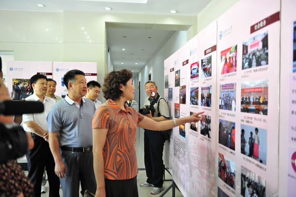 在中区办公楼大厅,中央统战部调研组一行观看了“专题展板”。图片展分为“亲切接见”、“领导关怀”、“党派组织”、“参政议政”、“组织建设”、“社会服务”、“党外人才”、“基层建设”、“荣誉印证”等部分,图文并茂,生动具体。吴晓礼局长一行驻足仔细观看展板上每一幅图片,认真聆听马立群校长关于图片背景和内容的概要说明,并不时就有关问题进行询问和交流,对农工党市委、校党委统战工作和农工党齐大支部建设与发展取得的佳绩予以肯定,尤其对党外人才队伍建设和特色品牌活动给予了高度评价。