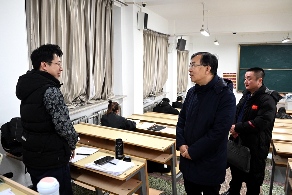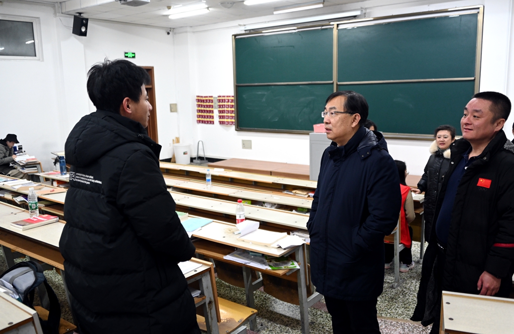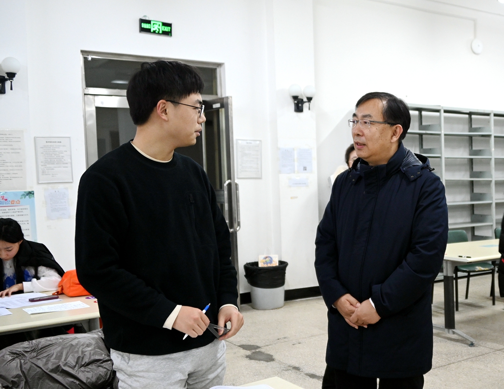 12月4日晚,校长郝文斌在教务处等相关部门负责人陪同下,来到学校中区图书馆、东区、中区和西区教学楼考研自习室,看望准备参加2024年研究生入学考试的学生。