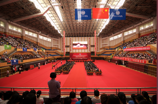 体育馆内,悬挂着“热烈欢送2013届全体毕业生奔赴祖国各地建功立业”,“爱心留母校毕业思进文明赴社会”、“情系母校心念同窗昂首展翅创造辉煌”,“挥手道珍重昂首笑春风”、“情系校园里心系大天地”,“一朝师生情毕业勉于怀”、“学子闯天下母校候佳音”等一幅幅巨大标语,一句句真诚祝福,充分彰显母校大爱情怀。
