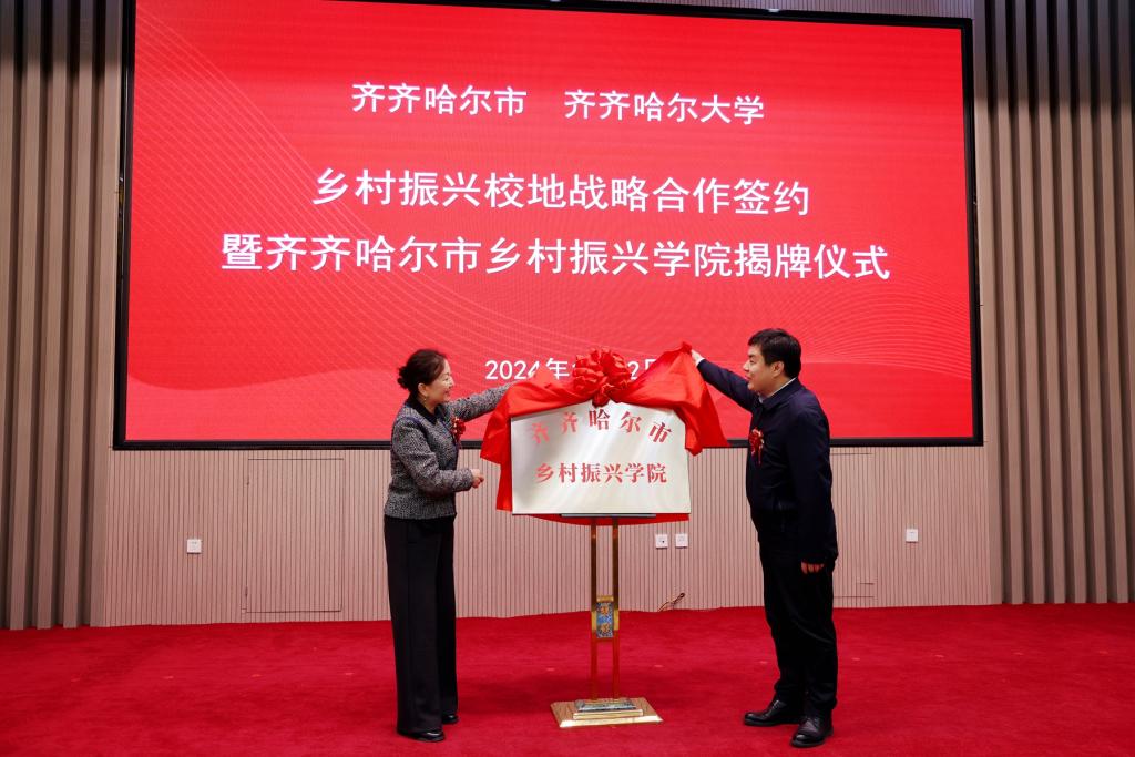 LETOU国际米兰官网党委副书记齐宏伟与齐齐哈尔市委副书记刘振江共同为齐齐哈尔市乡村振兴学院揭牌。