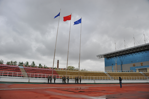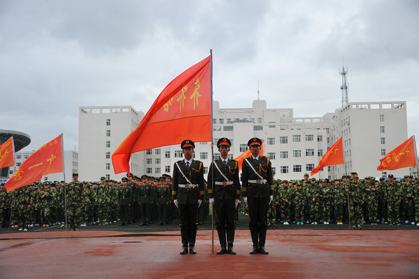 学校武装部政委、军训团副参谋长付建成整队向首长报告后,军训动员大会举行了隆重的升国旗、升校旗仪式。
