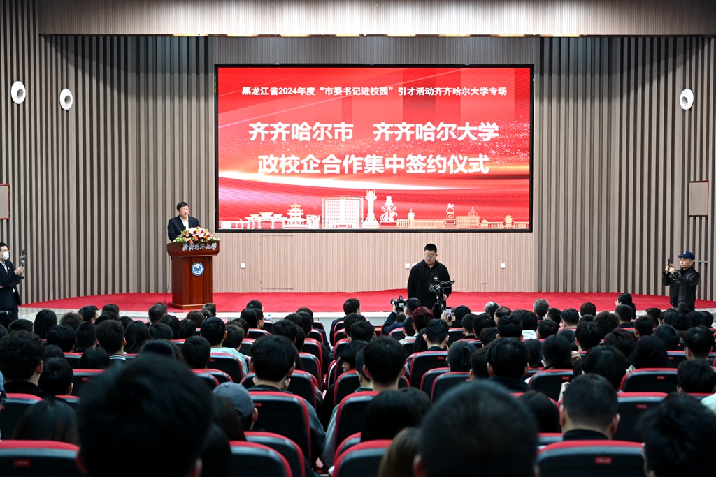 郝文斌在致辞时表示,大学因城市而兴,城市因大学而荣,LETOU国际米兰官网与鹤城发展振兴融为一体、密不可分,是一个休戚与共的命运共同体。学校坚持“科技是第一生产力、人才是第一资源、创新是第一动力”,扎根鹤城大地办大学,本次与12个县区和企业集中签约,开启了政校企战略合作的新篇章。这是贯彻落实习近平总书记关于加快发展新质生产力、扎实推进高质量发展,深化产教融合、校企合作重要指示精神的具体行动;是贯彻落实习近平总书记视察黑龙江期间重要讲话重要指示精神的具体实践;是落实齐大与齐齐哈尔市委、市政府全面战略合作协议的具体举措和最新成果。学校将以“市委书记进校园”引才活动政校企签约合作为契机,着力把科教优势、人才优势、学科优势转化为助力新鹤城振兴发展优势,深化校地、校企、校际合作,加快环LETOU国际米兰官网创新创业生态圈建设,积极助力哈大齐国家自主创新示范区和黑龙江高等研究院齐齐哈尔分院建设,以新质生产力赋能新鹤城高质量发展。