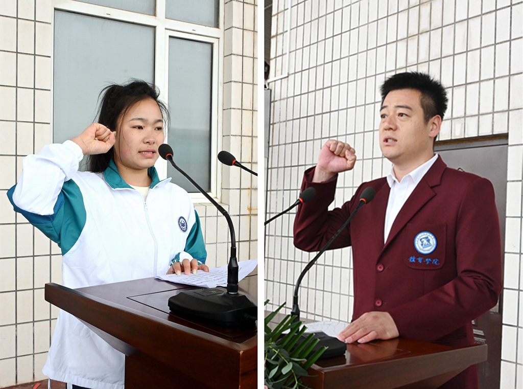 运动员代表、学校第二十二届田径运动会十佳运动员、理学院数学与应用数学(师范类)专业王晓婷同学代表全体运动员宣誓,裁判员代表、体育学院教师马正辉代表全体裁判员宣誓。