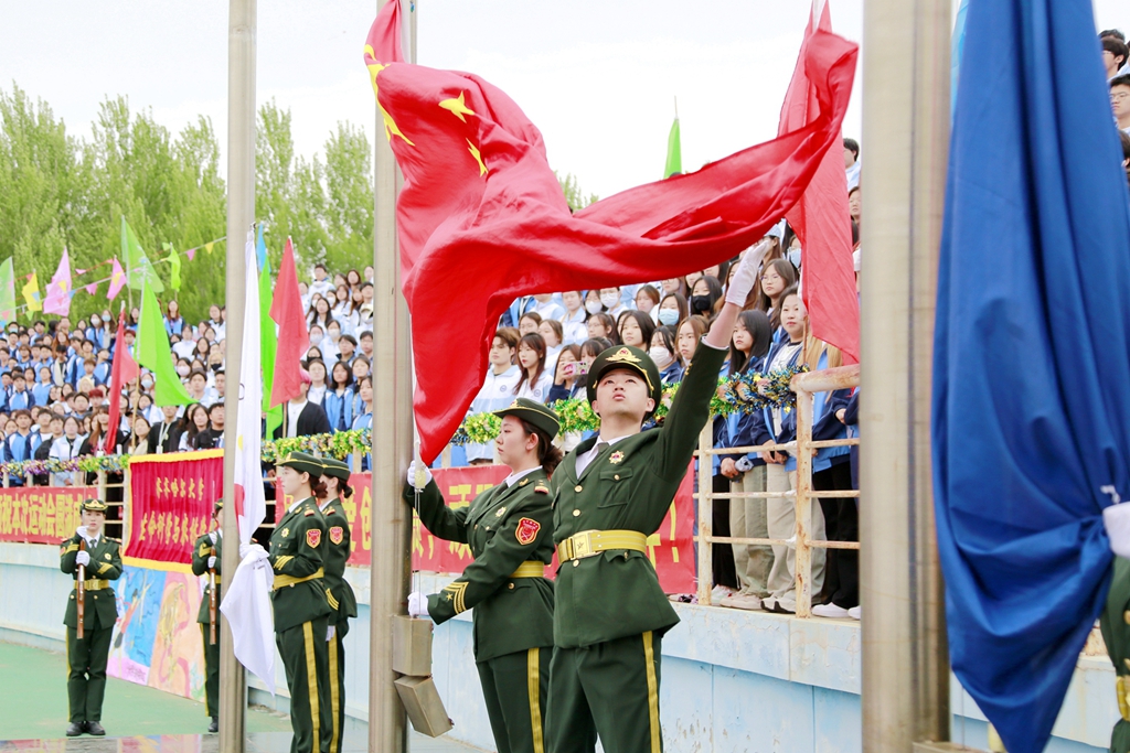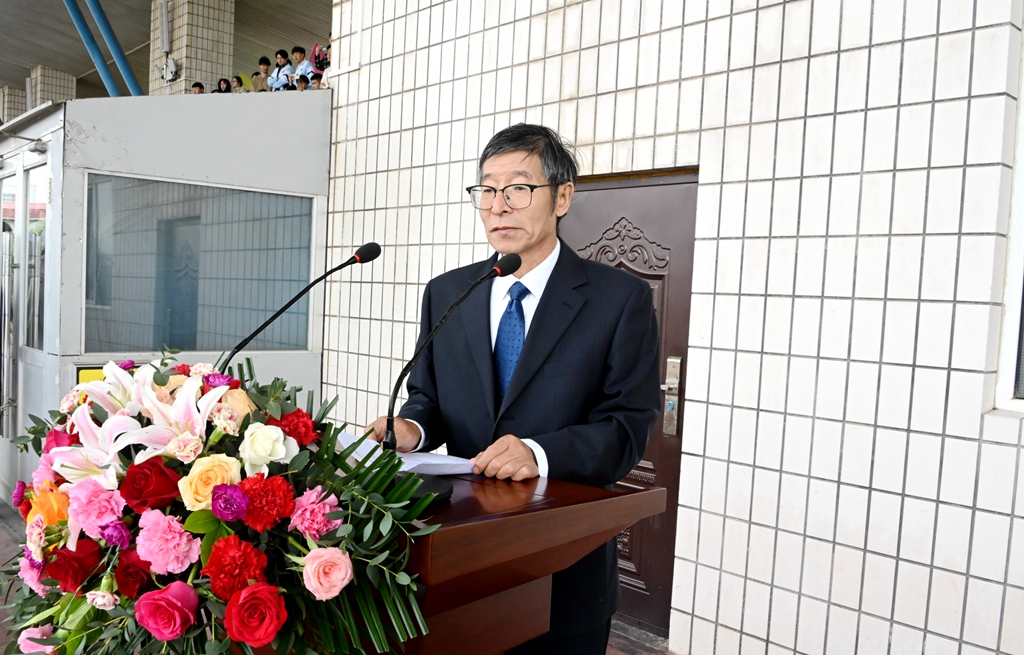 在庄严的升旗仪式结束后,校长郝文斌在大会上致开幕辞。他代表学校向全体师生、向参赛运动员致以亲切的问候!向为本届运动会筹备和召开辛勤付出的裁判员、大会工作人员致以诚挚的敬意!