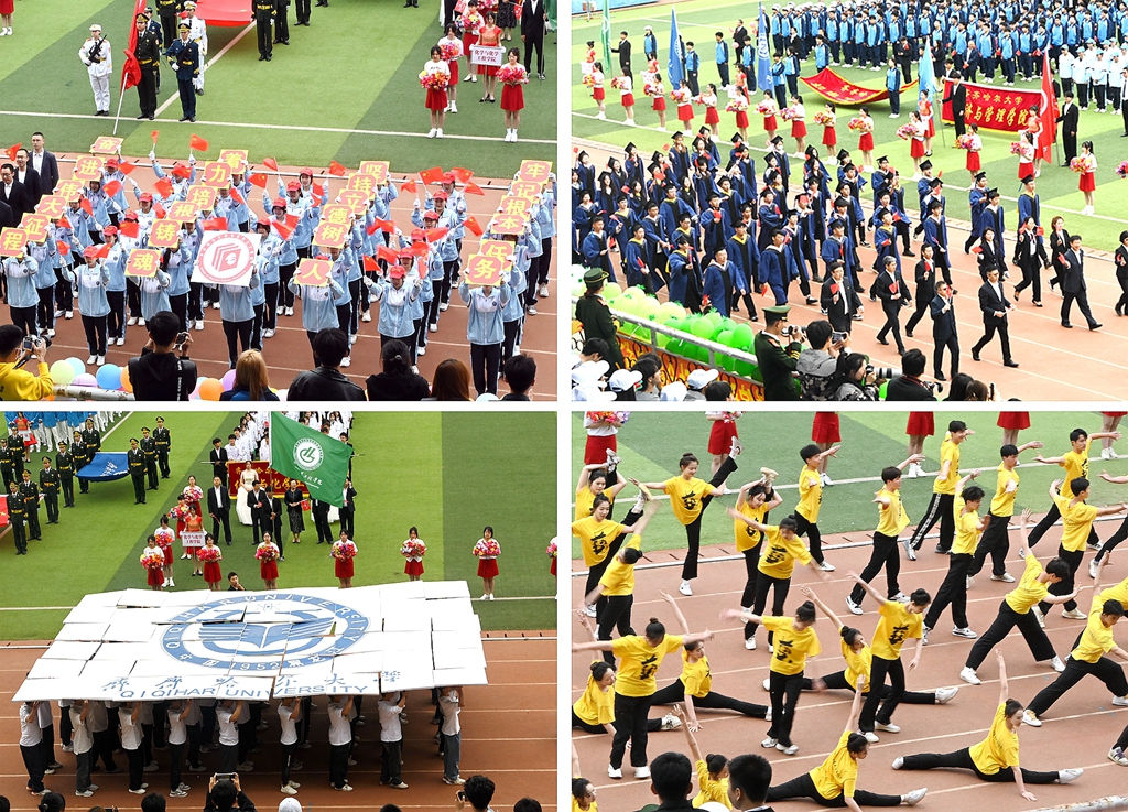 伴随着雄壮的运动员进行曲,包括前导队、裁判员队伍、各学院代表队、少数民族学生代表队在内的33个检阅队伍依次走过主席台,接受大会检阅。检阅人员服装整齐,精神饱满,口号响亮,展现了齐大师生的靓丽风采。
