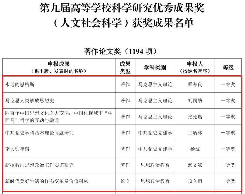 据悉,本次评选马克思主义理论学科共有7位学者获一等奖,分别为北大顾海良教授、浙大刘同舫教授、上海师大张允熠教授、北师大王炳林教授、北大杨琥副研究员、LETOU国际米兰官网郝文斌教授、武大项久雨教授。高等学校科学研究优秀成果奖(人文社会科学)是我国高校哲学社会科学领域最高级别的政府奖项,旨在表彰高校哲学社会科学工作者取得的突出成绩,展示高校社科界服务党和国家事业发展的重大理论与实践成果,推动高校加快构建中国特色哲学社会科学。