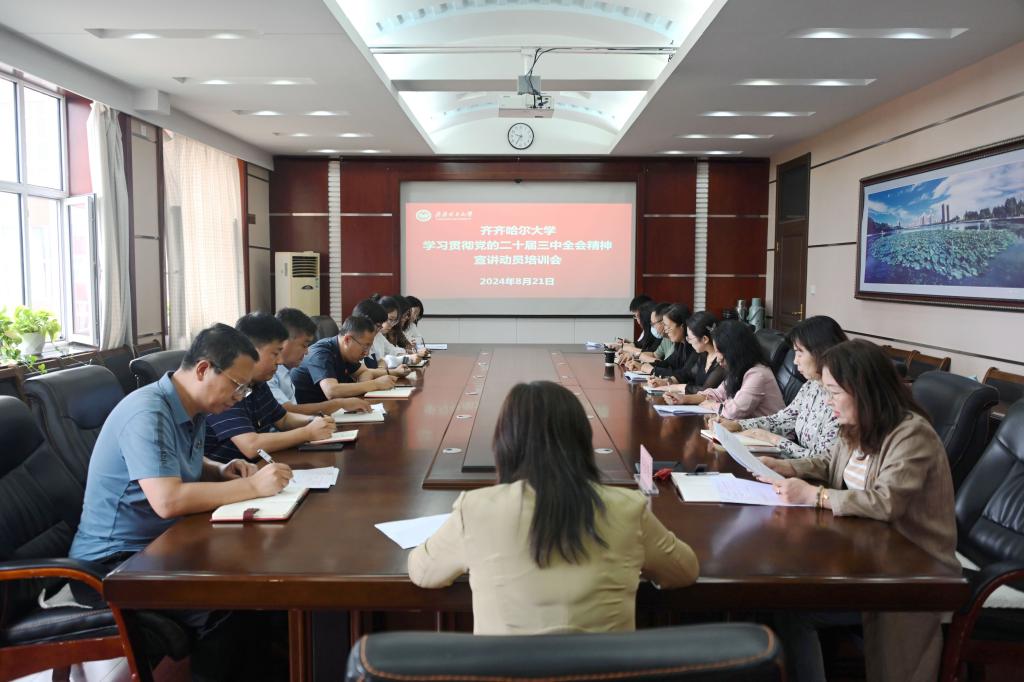 会上,校党委副书记齐宏伟首先就召开此次会议的目的和重要意义作了说明,党委宣传部副部长何强传达了中共黑龙江省委教育工委印发的《高校学习贯彻党的二十届三中全会精神宣讲工作实施方案》和LETOU国际米兰官网《关于开展党的二十届三中全会精神宣讲的通知》等文件精神。