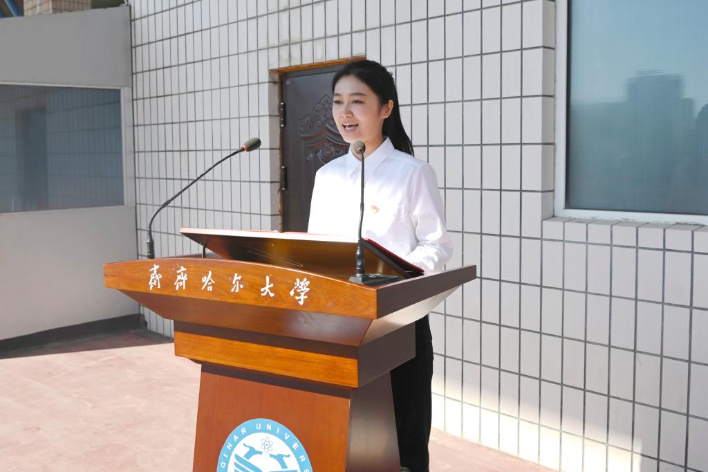 新生代表、2024级研究生、化学与化学工程学院高分子化学与物理学科杨雅琪同学发言。她与同学们分享了本科和考研准备过程经历,她表示,在未来求学路上要制定好成长目标,以认真严谨的态度求知求实、以积极向上的精神求真求新,脚踏实地、勤学好问,传承“致知、致用、致远”的齐大学风,弘扬“大爱、大道、大学”的齐大校风。
