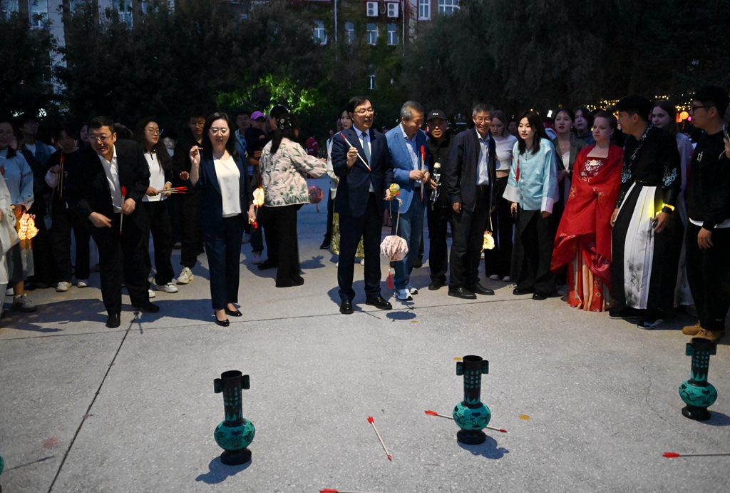 月光湖影遥相映,师生情溢齐大园。本次活动共划分“华灯璀璨”“华服锦绣”“华风典雅”三个单元,设置了DIY花灯、团扇制作、古风发饰体验、香包制作、茶艺体验、中国结制作、书法、投壶等多个精彩环节。老师和同学们或亲手制作花灯,体验传统工艺的魅力;或学习团扇制作,感受古典艺术的韵味;或制作古风发饰,体验穿越时空的魅力……游园会现场人流涌动,师生们穿着古风华服,在古筝的伴奏下,徜徉在花灯映照下的长廊,共同欣赏着中秋的明月,享受着这温馨而难忘的时刻。这一夜的美丽环湖大学,守正与创新交融,古典与现代相遇,繁华与静怡共存,成为了共度佳节的每一位师生最美好的记忆。
