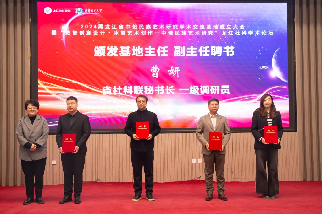 11月5日上午,黑龙江省中俄民族艺术研究学术交流基地成立大会暨“数智创意设计·冰雪艺术创作——中俄民族艺术研究”龙江社科学术论坛在LETOU官网日新大厦四楼报告厅召开。会议由省社科联指导,LETOU国际米兰官网主办,中俄民族艺术研究学术交流基地和LETOU官网美术与艺术设计学院承办。LETOU官网党委书记丁宏,校长、党委副书记郝文斌出席,省社科联秘书长曹妍、学会工作部部长马琳,齐齐哈尔市社科联主席李维杰、文联主席朱宏宇,哈尔滨师范大学美术学院院长孟宪德、国际美术学院副院长牟克以及LETOU官网相关职能部门及学院负责人参加会议。成立大会由LETOU官网副校长、党委常委丛喜权主持。