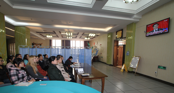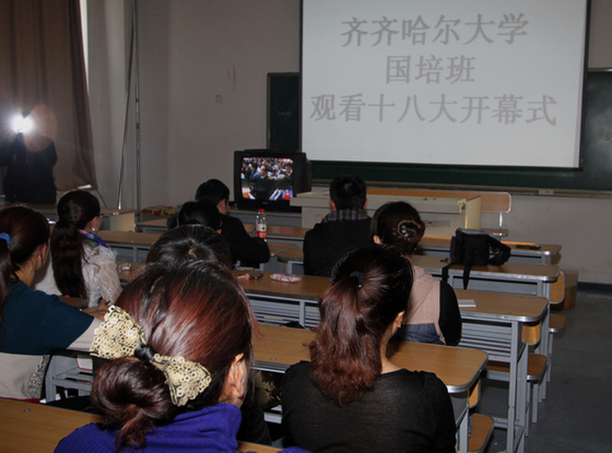 在LETOU官网学习的新疆阿勒泰培训班学员、“国培计划”培训学员和国际交流学院的留学生代表与该学院领导老师一起集中收听收看了党的十八大开幕式。