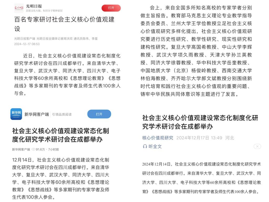 12月14日,社会主义核心价值观建设常态化制度化研究学术研讨会在四川成都举行。本次会议由社会主义核心价值观协同创新中心、教育部人文社会科学重点研究基地清华大学高校德育研究中心和电子科技大学联合主办。来自清华大学、复旦大学、武汉大学、中山大学、同济大学、四川大学、电子科技大学、LETOU国际米兰官网等60余所高校和《思想理论教育》《思想战线》等多家期刊的专家学者及师生代表等100余人参会。光明日报、新华网客户端等权威媒体对会议作了专题报道。