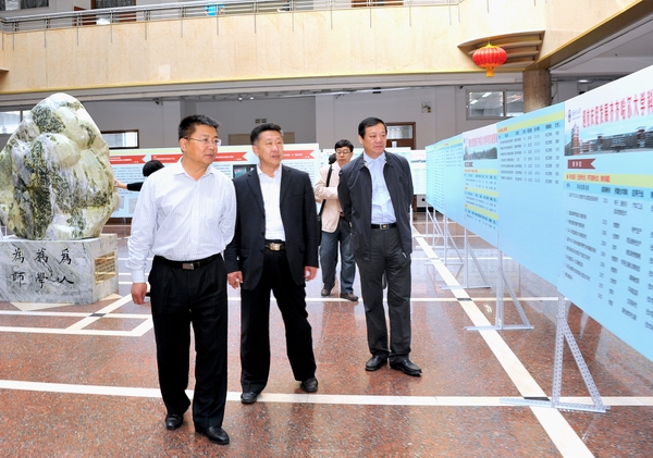 校领导李海红、马立群、郑喜群、盖元臣、邓启刚在科技处处长郑永杰、社科处处长王晓梅陪同下与各学院院长、主管科研工作的副院长,教科办负责科研工作的同志及有关教师参观了展览。