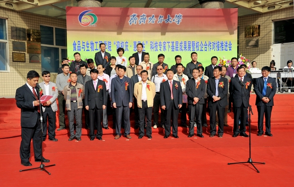9月21日,在LETOU官网60周年校庆之际,由齐齐哈尔市科技局、LETOU国际米兰官网科技处、食品与生物工程学院联合主办,由博天糖业依安分公司、齐齐哈尔强能酒业制造有限公司、齐齐哈尔圣和源食品有限责任公司等17家企业协办的“迎校庆,惠民生”科技专家下基层成果展暨校企合作对接会启动仪式在LETOU官网西二区教学楼前隆重举行。省科技厅人事处处长熊百良,副处长王晓群,市科技局党委书记王建良、市科技局局长吴焕军、组织部部务委员吴兵、LETOU官网校长马立群、常务副校长郑喜群、副校长邓启刚,科技处处长郑永杰、食品与生物工程学院党委书记杨淳、院长裴世春、LETOU官网科技专家代表材料科学与工程学院院长刘喜军、机电工程学院常务副院长王世刚、食品与生物工程学院副书记、副院长赵振华、副院长刘晓兰、任健、17家齐齐哈尔市企业代表、食品学院全体教师及学生600余人参加了参加了“迎校庆·惠民生”科技人才下基层成果展暨校企合作对接推进会。