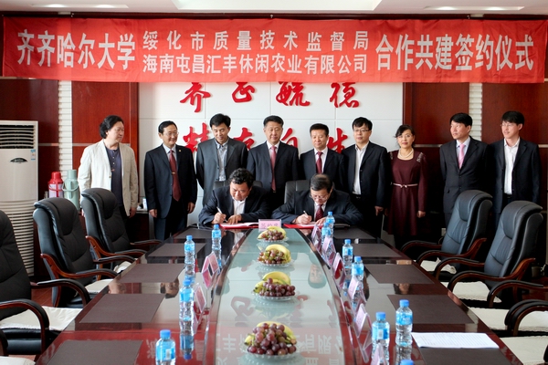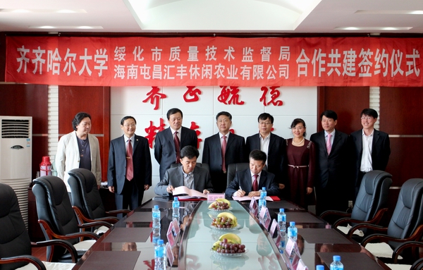会上,副校长李英杰代表学校与绥化市质量技术监督局局长刘晓光、副校长邓启刚代表学校与海南屯昌汇丰休闲农业有限公司董事长于立峰正式签署了合作共建协议。