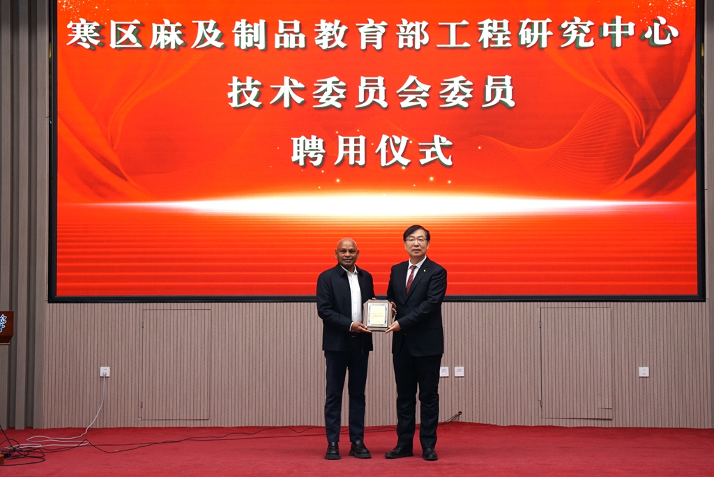 在聘任仪式上,校长郝文斌代表学校发表致辞,并为西拉姆院士颁发聘任证书。他表示,西拉姆院士的受聘不仅为寒区麻及制品教育部工程研究中心注入了国际化的学术视野,也将在新型纺织材料的功能化开发、先进制造工艺的优化及可持续技术的应用等方面提供强有力的学术支撑。依托西拉姆院士的前沿学术理念和丰富科研经验,寒区麻及制品教育部工程研究中心将在科研能力提升、学科建设优化及产学研合作深化等方面持续探索,积极推动跨学科融合,拓展新型纺织材料的研究方向。同时,寒区麻及制品教育部工程研究中心将加强科技创新,推动关键技术的发展与应用,促进创新成果的高效转化,不断提升学校在相关领域的学术影响力和技术创新能力,为学科建设和行业发展作出更大贡献。