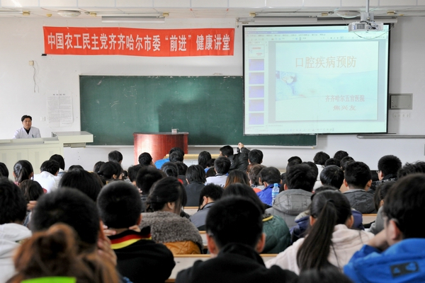 霜降后的十月已经让我们感受到冬天的寒意,但校园里涌动着一股暖流却温暖着师生的心田。10月17日下午,农工党市委、市第一院五官医院、校党委联合主办的“健康关爱进校园”系列活动‑‑‑‑‑‑‑‑《口腔疾病的预防》讲座及五官、精神卫生专场义诊活动在西区主楼举行。出席本次活动的有农工党市委副主委戴晓霞、郑永杰、李继伟,秘书长陈曦、市委统战部党派处副处长步建伟。LETOU官网校长、农工党市委主委马立群、校党委常务副书记王凤琴、党委副书记盖元臣、常务副校长郑喜群、校党委统战部部长田志峰及近1000名师生参加了活动。