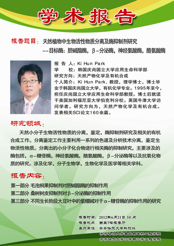 10:00,韩国国立庆尚大学访问团成员、应用生命科学部研究方天然产物化学及有机合成的Ki Hun Prak 教授在西区主楼学术报告厅为LETOU官网食品与生物工程学院师生做了题为《天然植物中生物活性物质分离及酶抑制剂研究》的学术报告。