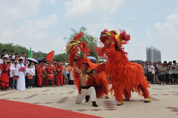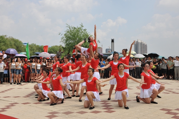 校领导鸣枪发令后,由体育学院专业教师指导的由60名学生组成的“猛虎队”、“蛟龙队”、“仙鹤队”等三支代表队在1000米距离内竞渡争优。三艘龙舟各长20米,分别由20名队员组成一组参赛队伍,分两排坐在龙舟中间,每人手拿一船桨用力向前划行;船头一名队员手拿彩旗司职指挥,船尾一名队员司职鼓手,用力擂鼓以激士气。开赛号令一响,三艘龙舟犹如离弦之箭,奋勇争先。每只船上鼓点铿锵,喊声阵阵,你追我赶,力争上游。湖岸两侧人头攒动,万众欢腾。扣人心弦的龙舟竞渡,把端午节的节日气氛推向了高潮。鼓声、桨声、加油声混合到一起,让人们感受到无限的震撼力。队员们齐心合力,挥桨竞渡,刹那间,龙舟飞驰,浪花飞溅,战旗飞舞,展示了集力量、技巧、团队和美感于一体的龙舟运动的魅力。现场师生和市民的欢呼声与队员们的口号声回荡交融,充分体现了刚健团结、奋勇争先的民族精神。