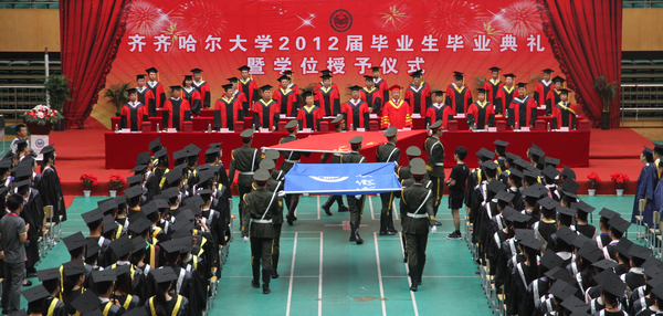 校领导李海红、马立群、王凤琴、盖元臣、张学军、郑喜群、邓启刚、王刚、吕晓辉、李英杰、李敏义出席典礼并为毕业生代表颁发毕业证书。校学位委员会成员、各学院院长与校领导一起身着导师服在典礼主席台就坐。各学院有关领导、老师、即将奔赴祖国各地的省、校优秀毕业生代表、在校生代表等3000余人参加了毕业典礼暨学位授予仪式。