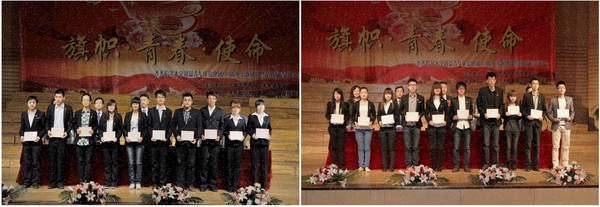 黑龙江省优秀团干部、校“十佳”优秀团干部代表、通信与电子工程学院团委书记迟生茂老师和学校“党建带团建”“党团共建”暨共青团组织创先争优活动“十佳、百先、千优”先进集体代表、校学生会直属团支部书记、学生会主席、食品与生物工程学院食品科学与工程专业09级学生肖振天同学分别代表获奖师生代表发言。