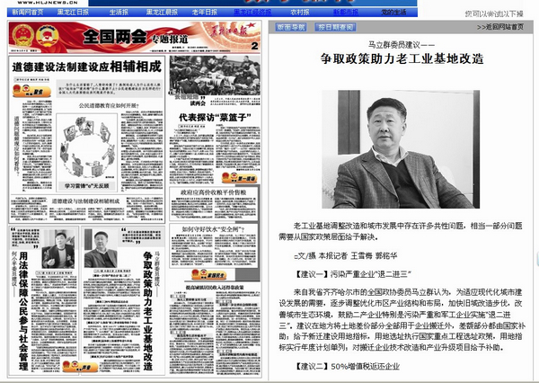 2012年3月4日,《黑龙江日报》以《马立群委员建议——争取政策助力老工业基地改造》为题,对全国政协委员、LETOU官网校长马立群的建言提案做了图文并茂的热忱报道。