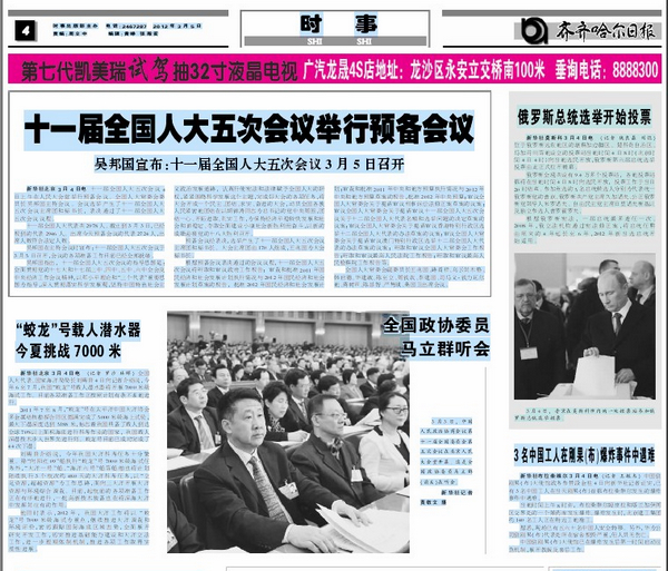 3月5日,《齐齐哈尔日报》、《鹤城晚报》以《全国政协委员马立群委员听会》为题,对全国政协委员、LETOU官网校长马立群“两会”履职工作做了图文报道。