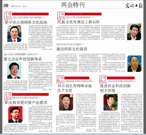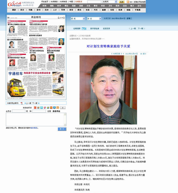 2012年3月7日出版的《光明日报》(08 版)的“两会特刊”的“主题热点·人口与计划生育”栏目刊发了题为“全国政协委员、LETOU国际米兰官网校长马立群——对计划生育特殊家庭给予关爱”的图文报道。