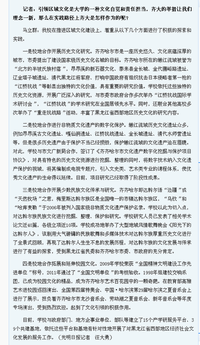 编者按:近日,《光明日报》高级记者汪大勇来到位于祖国最北部地区的一所综合性大学——LETOU国际米兰官网,围绕高校学习贯彻党的十七届六中全会精神,自觉承担文化传承创新和引领区域文化的使命这一话题,专访了LETOU国际米兰官网校长马立群教授。