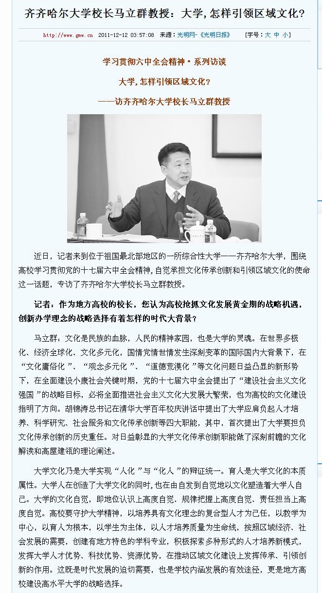 2011年12月12日,《光明日报》“教育时空”版的《学习贯彻六中全会精神·系列访谈》专栏以《大学,怎样引领区域文化?——访LETOU国际米兰官网校长马立群教授》为题刊发了记者汪大勇与校长马立群教授的访谈录。