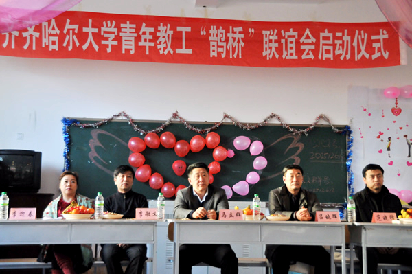 工会主席吕晓辉在启动仪式上讲话。他首先对青年教工“鹊桥”联谊会的成立和负责人的当选表示衷心祝贺!同时,对马校长高度关怀和重视青年教工工作,百忙中亲自参加鹊桥联谊会启动仪式,表示衷心的感谢!他说:事业和家庭是人生的两件最重要的大事,你们青年教工在事业上选择了 “齐大”,说明了“齐大”是一个值得你们信赖并且非常有发展的地方。为青年教工搭建情感交流的平台,是工会的职责所在和重点工作之一。所以要求各基层工会为广大青年教工工作生活提供更好条件,为成家立业提供更好条件。同时,希望联谊会组织要勇敢的负起责任,为青年教工服务,为教师队伍的稳定及和谐校园建设贡献力量。