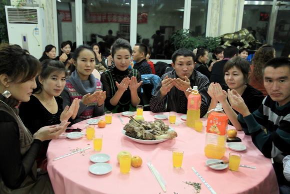 奇合斯别克做巴塔仪式后,晚宴正式开始。马立群、郑喜群带领校相关部门的负责人走进学员中,与同学们亲切交谈、互致祝福,举杯同庆“古尔邦节”。