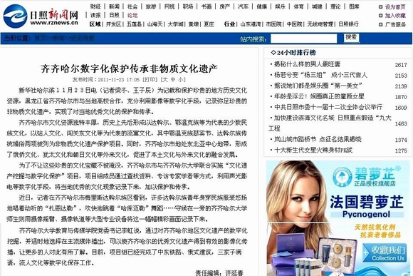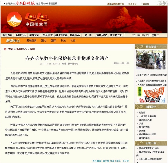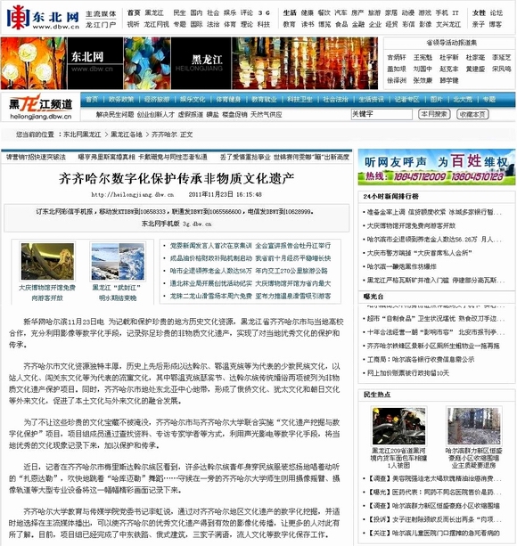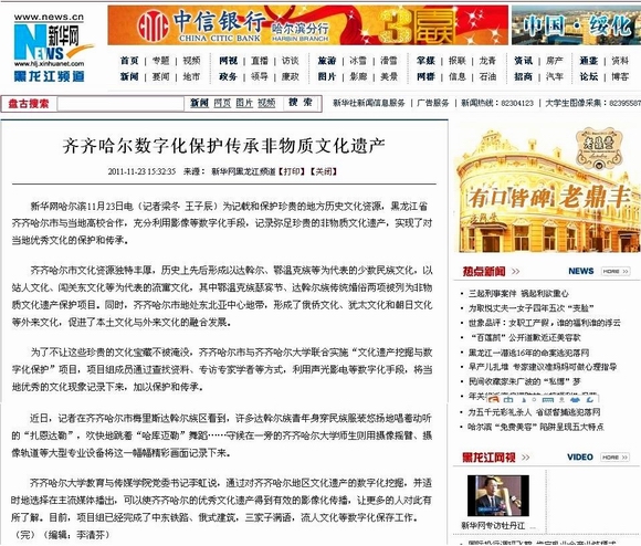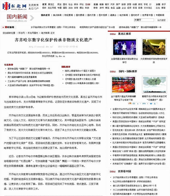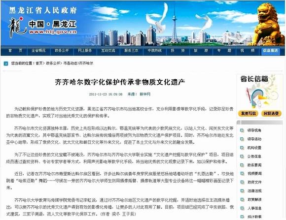 近日,新华社黑龙江分社记者梁冬、王子辰深入LETOU官网和齐齐哈尔市,就文化遗产数字化保护项目的进展情况进行采访,并以“齐齐哈尔数字化保护传承非物质文化遗产”为题进行了报道,引起了国内多家媒体广泛关注,在社会产生了积极影响。