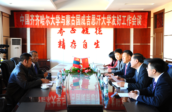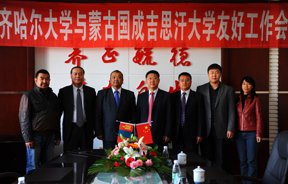 会谈结束后,马立群校长代表学校、拉瓦苏荣校长代表蒙古国成吉思汗大学在两校合作办学有关文本协议上签字。会后,宾主双方互赠礼品并合影留念。