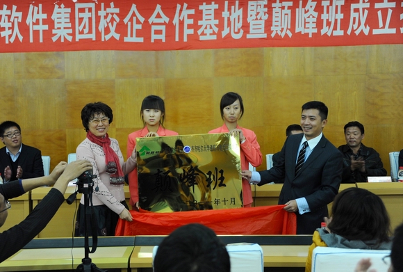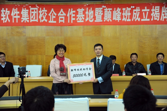 在热烈的掌声中,副校长郑喜群和颠峰软件集团总裁吴剑为LETOU国际米兰官网与颠峰软件集团校企合作基地成立揭牌;通信与电子工程学院常务副院长姚仲敏和颠峰软件集团总裁吴剑先生为“颠峰班”成立揭牌;颠峰软件集团总裁吴剑为首届“颠峰班”颁发奖助学金伍万元。