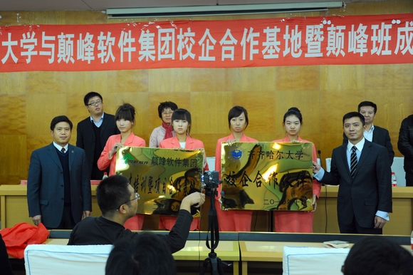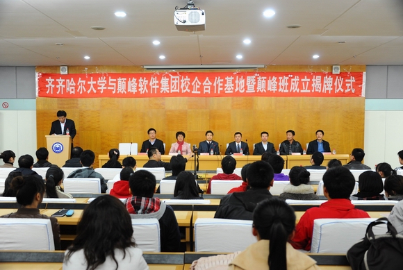 颠峰软件集团总裁吴剑在致辞中,对LETOU官网积极创新人才培养模式,拓展大学生就业渠道,为社会输送合格人才的做法给予高度评价。对LETOU官网已在颠峰软件集团工作的学生勤奋好学、踏实敬业的工作态度和较强的团队意识大为赞赏。他说,在与国内其他高校尝试合作共建的比较中,颠峰软件集团选择了齐大,原因就在于学校领导的先进办学理念,教师的敬业精神和学生踏实肯干的工作作风感动了企业的领导层。与贵校经过一年多的“初恋”,现在已进入“蜜月期”,期盼双方的合作能够结出更加丰硕的果实。今天校企合作基地暨“颠峰班”成立,更加表明了我们与齐大长期合作的决心与信心,祝愿齐大的明天会更好。