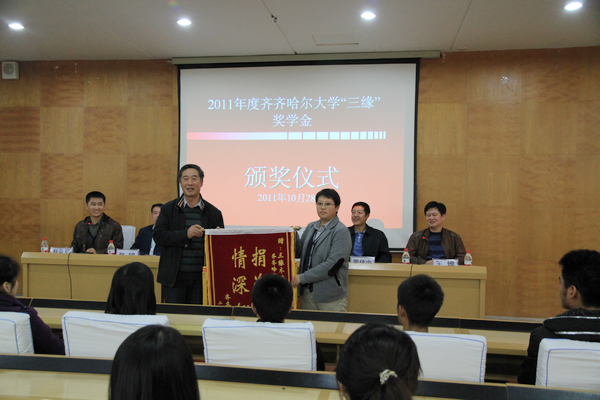 经济与管理学院院长王维宣读了2011年度获得奖学金学生名单。LETOU官网经济与管理学院校友、三缘木业齐齐哈尔瑞驰木业有限公司总经理张书齐女士,获奖学生代表、市场营销专业082班窦胜昌同学分别在颁奖仪式上致辞。