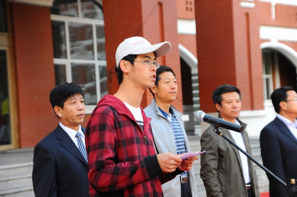 在出征仪式上,LETOU官网文学与历史文化学院2011级历史系研究生刘贺代表参加“重走抗战路”主题活动的全体学生在启动仪式上发言,表达了“永远跟党走、永铸民族魂”的坚强决心,发出了当代大学生弘扬抗战精神、勇担时代重任的铿锵誓言。