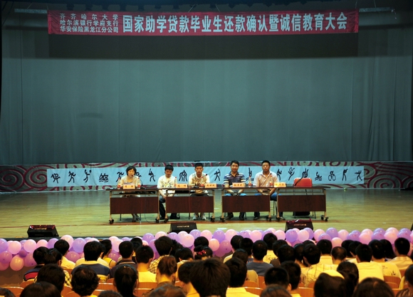为全面贯彻落实国家助学贷款有关政策,认真履行LETOU官网和哈尔滨银行学府支行于2007年8月所签订的“国家助学贷款全面合作协议”,6月20日,LETOU官网召开了国家助学贷款毕业生还款确认暨诚信教育大会。学校财务处副处长张月武、学生工作处副处长张树启、哈尔滨银行学府支行经理高伟、华安保险黑龙江分公司经理麻世锐出席了本次还款确认会议。校学生工作处学生资助科老师、银行部分工作人员及全体哈尔滨银行国家助学贷款2011届毕业生参加了会议。会议由学生工作处学生资助科李静科长主持。