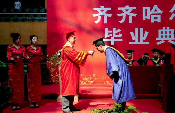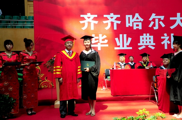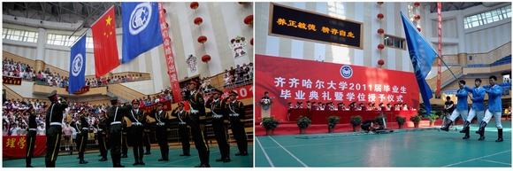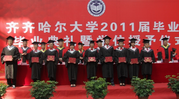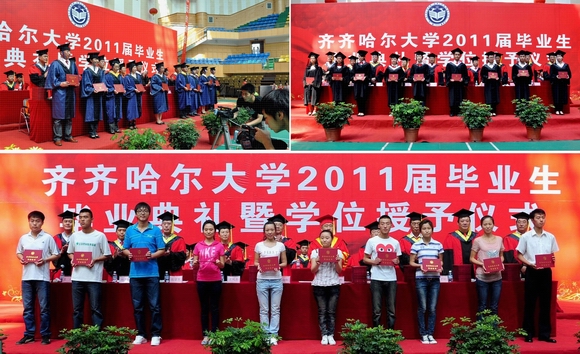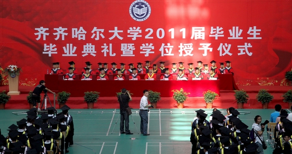 毕业典礼暨学位授予仪式会场布置得格外隆重热烈。“热烈欢送2011届全体毕业生奔赴祖国各地建功立业!”“亲爱的同学,你们是母校永远的牵挂!”“亲爱的同学,你们的未来“被”齐大记忆!”“毕业万岁,青春万岁,梦想万岁,友谊万岁!”的巨大条幅悬挂在会场两侧,将母校的关怀与祝福传递给2011届全体毕业生。