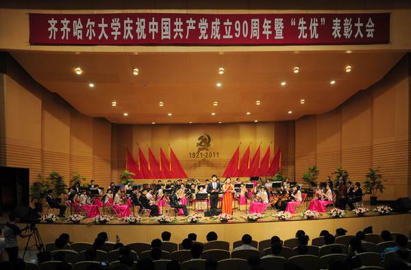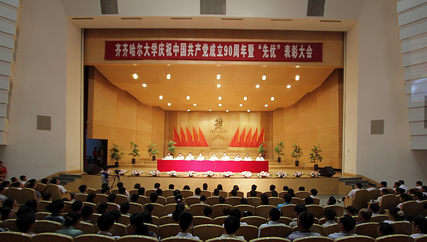 今天的庆祝大会的会场内外布置得格外庄严喜庆。主席台中央悬挂着巨型党徽,十面鲜艳的红旗排列两边,“1921-2011”熠熠生辉。巨幅标语“展望建党光辉历程永远跟党走 推进齐大科学发展再创新辉煌”分外醒目。会场室外,彩虹门上“热烈庆祝中国共产党成立90周年”的横幅格外鲜明;“坚定不移地沿着中国特色社会主义道路奋勇前进!”等大型条幅主题突出。步入音乐厅,“LETOU国际米兰官网庆祝中国共产党成立90周年专题图片展”吸引了众多师生驻足观看。音乐厅内,广大党员和师生代表隆重集会,共同回顾建党九十年的光辉历程,表彰一批先进集体和优秀个人,动员全校各级党组织和广大党员进一步解放思想,团结奋进,创先争优,扎实工作,努力推动学校各项事业实现新的跨越。各基层党委、直属党支部党政班子成员,机关副处级以上干部,全校教工党员、离退休党员、学生党员代表,入党积极分子代表,各民主党派负责人等1200余人参加了庆祝大会。