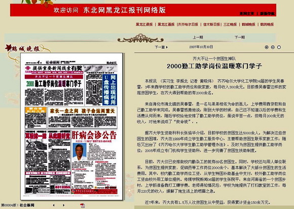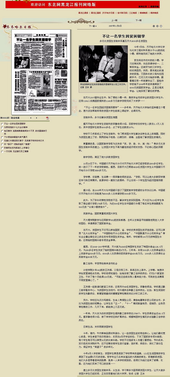 编者按:关爱贫困学生,构建和谐校园,是LETOU官网全面贯彻党的教育方针,坚持以人为本育人理念的重要举措。近年来,LETOU官网扎实的资助工作、良好的育人成效,赢得了社会的称誉。10月30日的《鹤城晚报》以《2000勤工助学岗位温暖寒门学子》为题热忱报道了LETOU官网支持和帮助经济贫困学生开展勤工助学工作的情况;11月6日的《齐齐哈尔日报》以《不让一名学生因贫困辍学》为题热忱报道了LETOU官网多元化贫困生资助体系所取得的良好成效。齐齐哈尔新闻网等媒体对报道情况给予了转载。